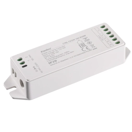 Controller (Steuergerät) für unsere RGB 12/24V LED Leuchtstreifen, Bemessungsstrom max. 10A, Reichweite max. 30m, Maße 120 (99) x 38 x 23mm LxBxH, zum Ansteuern des Controllers wird eine Fernbedienung 822234 benötigt.