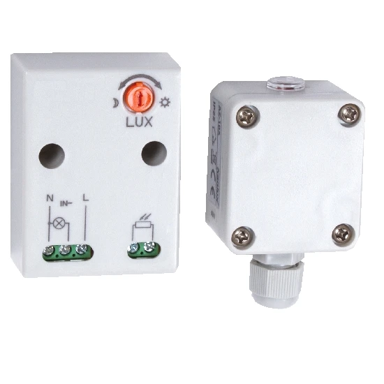 Einbau Tag/Nacht Schalter, 2-teilig, Schaltteil IP20 zum Einbau in Leuchten und Sensorteil zur Aufputzmontage im Außenbereich IP65, für max 25m Verbindungsleitung (nicht im Lieferumfang – z.B. 2 x 0,6mm²), Verlustleistung kleiner 1VA, Schaltleistung max. 2.300W bei Glüh- und Halogenlampen, max. 140 W Energiesparlampen, 90W bei Leuchtstofflampen und 35W bei LEDs, Schaltpunkt ist stufenlos einstellbar mit 20 Lux Hysterese, Maße Schaltteil: H 63 x B 48 x T 30mm, Maße Sensorteil: H 42 x B 50 x T 30mm.