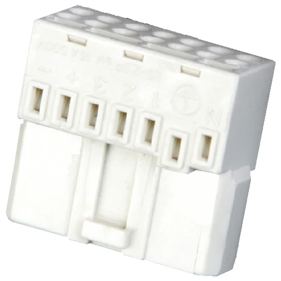 Einspeisestecker bzw. -buchse für Lichtband, zum Netzanschluß des Lichtbandes oder zur Verbindung unterbrochener Lichtbänder mit Stecker und Buchse untereinander, mit Steckklemmen.