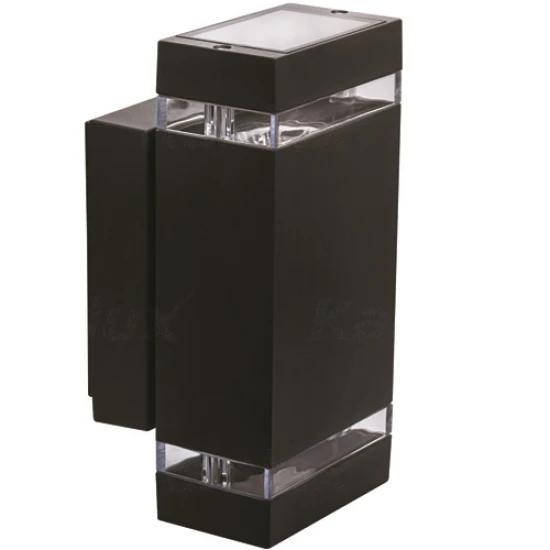 Moderne Fassadenleuchte aus schwarz lackiertem Aluminium und klarem Acrylglas, Lichtaustritt nach oben und unten, sowie seitlich über Acryglasring, für 2 Stück GU10 Leuchtmittel (nicht im Lieferumfang), max. 35 Watt, IP44 für den Innen- und Außenbereich geeignet, Maße 109 x 110 x 235mm (BxTxH), für Leuchtmittel aller Energieeffizienzklassen von A bis G geeignet (Werteskala von A bis G, Bestwert ist A).
