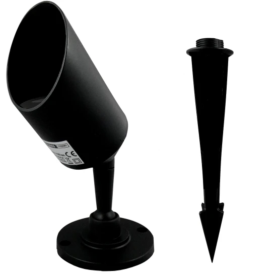 GU10 Gartenstrahler IP65, 230V, für GU10 LED Leuchtmittel max. 6 Watt (nicht im Lieferumfang enthalten), für den Innen- und Außenbereich IP65, Kunststoff schwarz, Strahler schwenkbar, 10cm Anschlußkabel mit Anschlußmuffe ohne Netzstecker, Montage wahlweise mit Fuß anschraubbar oder mit beiliegendem Erdspieß zum Einstecken in das Erdreich, Maße 80 x 60mm HxD, mit Erdspieß 340mm, für Leuchtmittel aller Energieeffizienzklassen von A bis G geeignet (Werteskala von A bis G, Bestwert ist A).