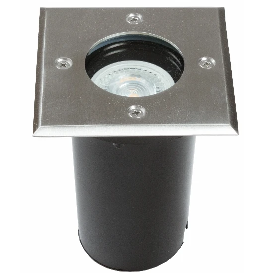 Hochvolt GU10 Bodeneinbaustrahler mit Anschlußkabel eckige Edelstahlabdeckung, 230V, IP67, begeh- und befahrbar bis 15 kN, für Innen und Außen geeignet, Aluminiumkörper mit Edelstahlabdeckung und Kunststoff-Bodengehäuse, mit klarer Sicherheitsglasscheibe, für GU10 LED Leuchtmittel bis 35 Watt (Leuchtmittel nicht im Lieferumfang enthalten), mit ca. 20cm Anschlußkabel zur einfachen Montage mittels Kabelmuffen, eckige Edelstahlabdeckung 110x110mm, Leuchtenhöhe 117mm, Aufbauhöhe 3mm, Einbaudurchmesser 95mm, für Leuchtmittel aller Energieeffizienzklassen von A bis G geeignet (Werteskala von A bis G, Bestwert ist A).