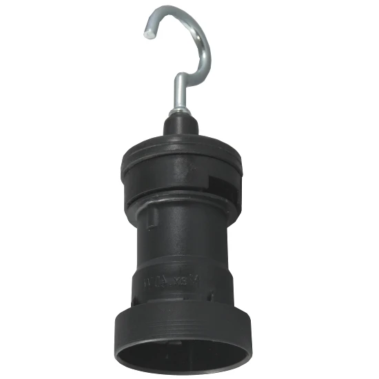 Illu Fassung E27 mit Aufhängehaken zur Errichtung von Illuminationen gemäß DIN VDE 0100 Teil 722, für Flachleitung H05RNH2-F, beim Einsatz im Außenbereich bitte Dichtung (Art.Nr. 661108) für Schutzgrad IP44 verwenden, max. 40 Watt, Farbe schwarz.