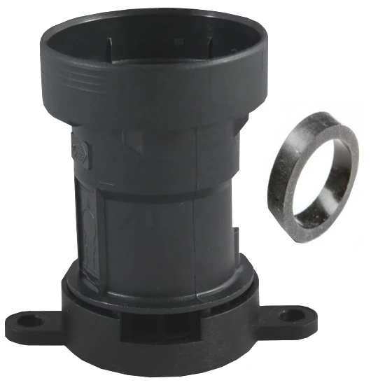 Illu Fassung E27 mit Befestigungsflansch und Lampendichtung, zur Errichtung von Illuminationen gemäß DIN VDE 0100 Teil 722, für Flachleitung H05RNH2-F, IP44, max. 40 Watt, Farbe schwarz.