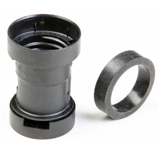 Illu Fassung E27 komplett mit Lampendichtung zur Errichtung von Illuminationen gemäß DIN VDE 0100 Teil 722, für Flachleitung H05RNH2-F, IP44, max. 40 Watt, Farbe schwarz.