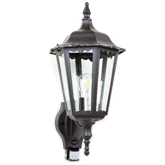 Elegante, klassische Wandleuchte für den Außenbereich, IP43, aus Aluminium und klarem Glas, 230V, E27, max. 100 Watt, Farbe matt-schwarz, mit Bewegungsmelder, stufenlose Zeiteinstellung von 5s bis 58min, Reichweite 5m, 180° Erfassungswinkel, Maße 230 x 290 x 480mm (BxTxH), Leuchtmittel im Lieferumfang nicht enthalten – für Leuchtmittel aller Energieeffizienzklassen von A bis G geeignet (Werteskala von A bis G, Bestwert ist A).