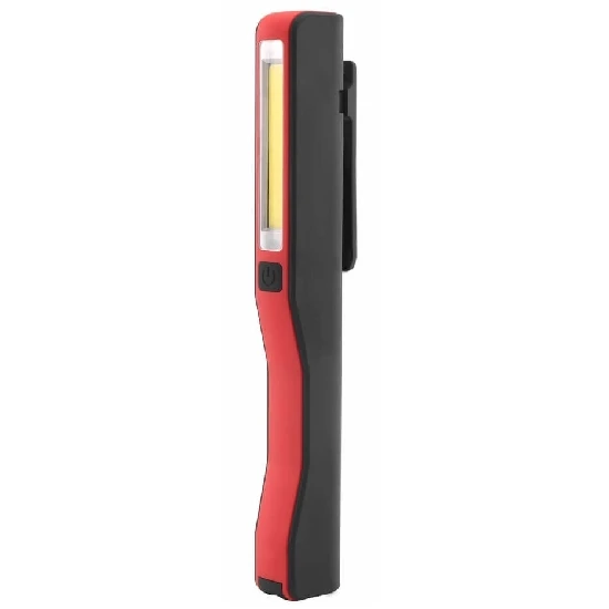 Batteriebetriebene Inspektionsleuchte mit COB LED Technik, drehbarer Clip mit Magnethalter, mit zwei Lichtquellen (3W Hauptlicht und 1W Zusatzleuchte am Kopf), robustes ABS Gehäuse, drei Leuchtfunktionen – Frontlicht 100%, Arbeitslicht 100% und Arbeitslicht 30%, IP54 Staub- und Spritzwassergeschützt, inkl. drei Micro AAA Batterien, Maße 185 x 35 x 20mm (BxHxT).