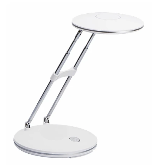 Elegante LED Schreibtischleuchte aus Guß und Kunststoff, mit zwei Gelenken, Farbe weiß, ca. 1,8m Zuleitung mit Netzstecker, Ein-Aus Schalter, 3,4 Watt, 170 Lumen, angenehme warmweise Lichtfarbe (3.000 Kelvin), gute Farbwiedergabe RA>80, 100° Abstrahlwinkel, Höhe 240 – 325mm, Sockdurchmesser 127mm, mittlere Lebensdauer 20.000h, fest eingebautes LED Leuchtmittel.