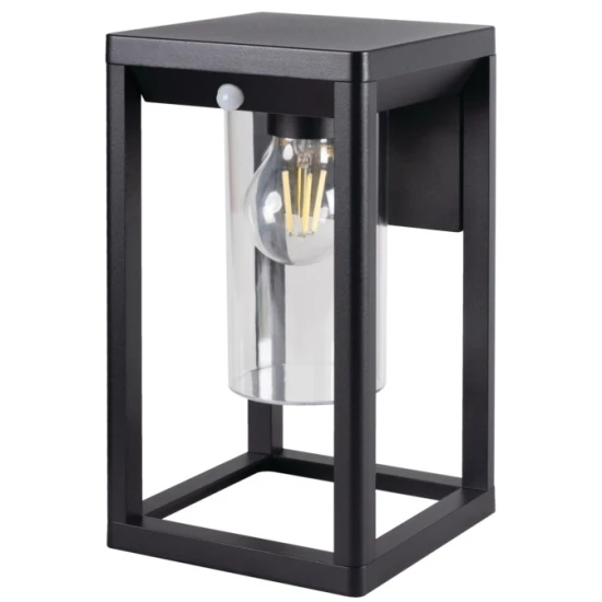 Vimo Wandleuchte schwarz mit Bewegungssensor, IP44 für den Innen- und Aussenbereich, E27 Fassung für austauschbare LED Leuchtmittel mit max. 15 Watt (Leuchtmittel im Lieferumfang nicht enthalten), moderne und einzigartige Form die an eine Laterne erinnert, Gehäuse aus einer wertigen Aluminiumlegierung in schwarz, zur Wandmontage, 270 x 150 x 165mm HxBxT, für Leuchtmittel aller Energieeffizienzklassen von A bis G geeignet (Werteskala von A bis G, Bestwert ist A).